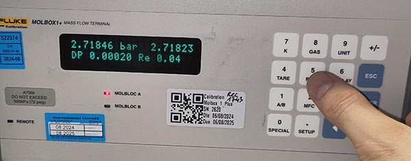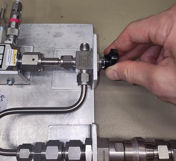 3. Apply the test pressure, which corresponds to the maximum process pressure expected during the subsequent calibration (typically 2.7 bar A for Molbloc-L calibrations or 5 bar A for sonic calibrations).