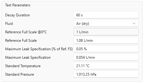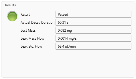 Once the test is complete, the results are shown in the Results section. This includes a clear indication of whether the test passed or failed, as well as key metrics such as the actual decay duration (always equal to or longer than the configured duration), the mass lost, the leak mass flow rate, and the standard volumetric leak flow—calculated at the standard temperature and pressure defined in the test settings.